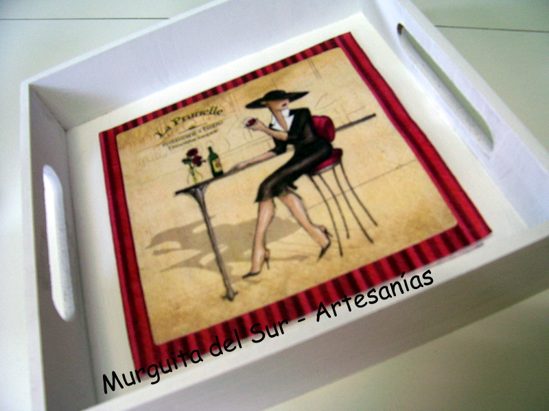 Bandejas de distintos tamaños y diseños pintadas a mano, con decoupage. Se las puede acompañar con la vajilla (toda a elección) y si se quiere agregarle el desayuno, que consta en: Alfajorcitos de Maizena - Infusiones (Té - Café - Barrita de Chocolate - Leche en Polvo - Azúcar - Edulcorante) - Baggio o Cepita - Galletitas dulces - Caramelos - Cindor - Magdalenas - Tostadas. Todo envuelto en celofan con moño de cinta al tono. Elegí la tuya!!